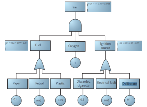 A fault tree identifies the sub-events that are necessary to cause a specified undesired event, such as an accident. Logic gates are used to show how the sub-events combine together to cause the undesired event.
